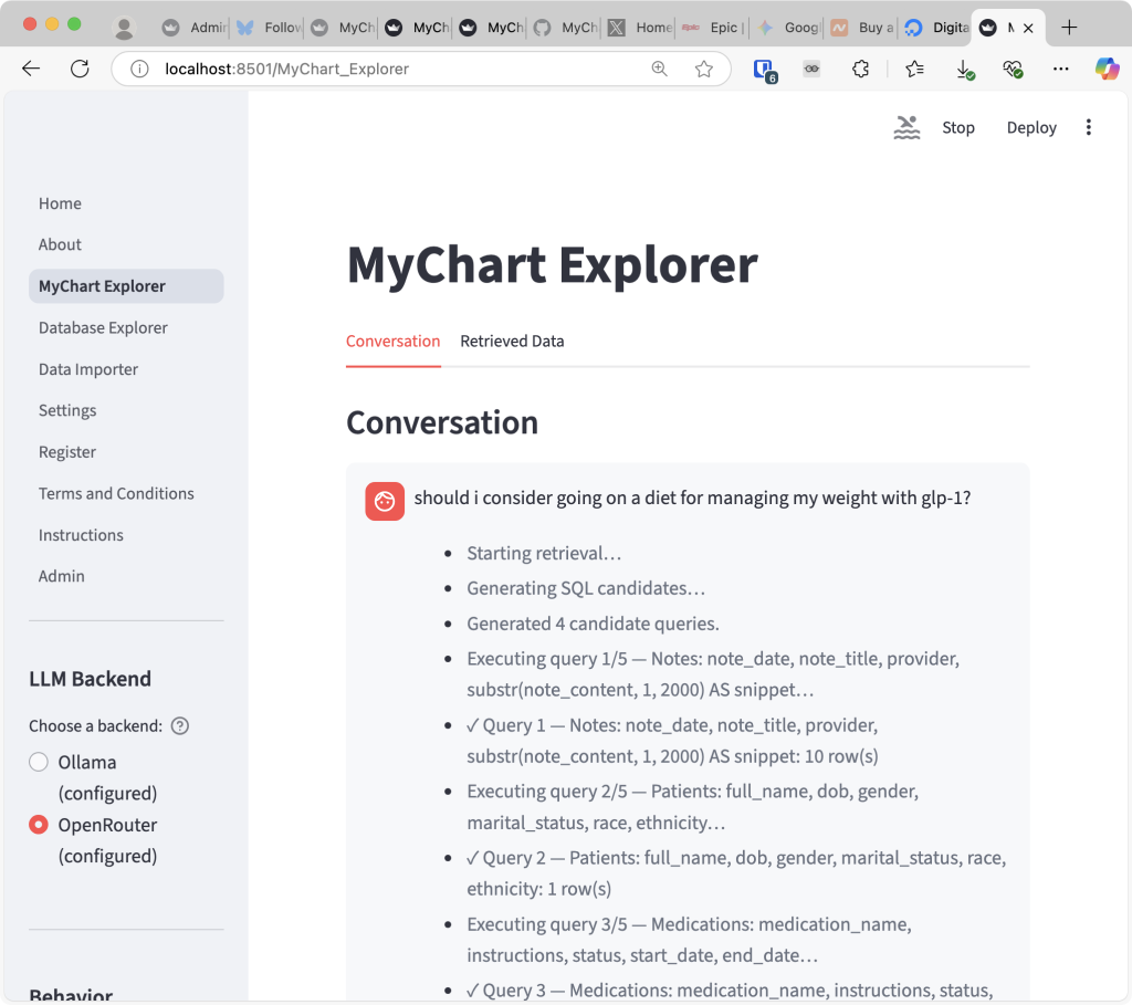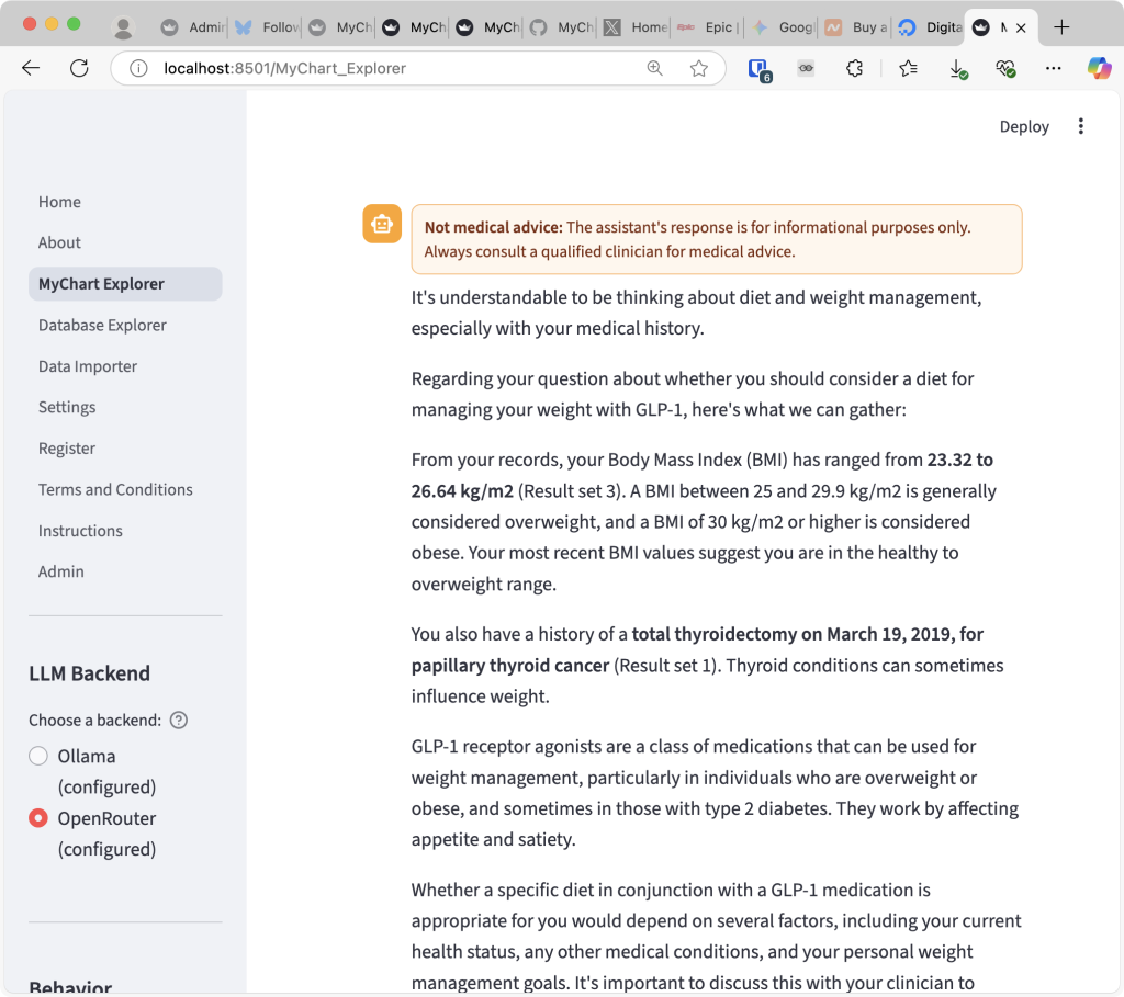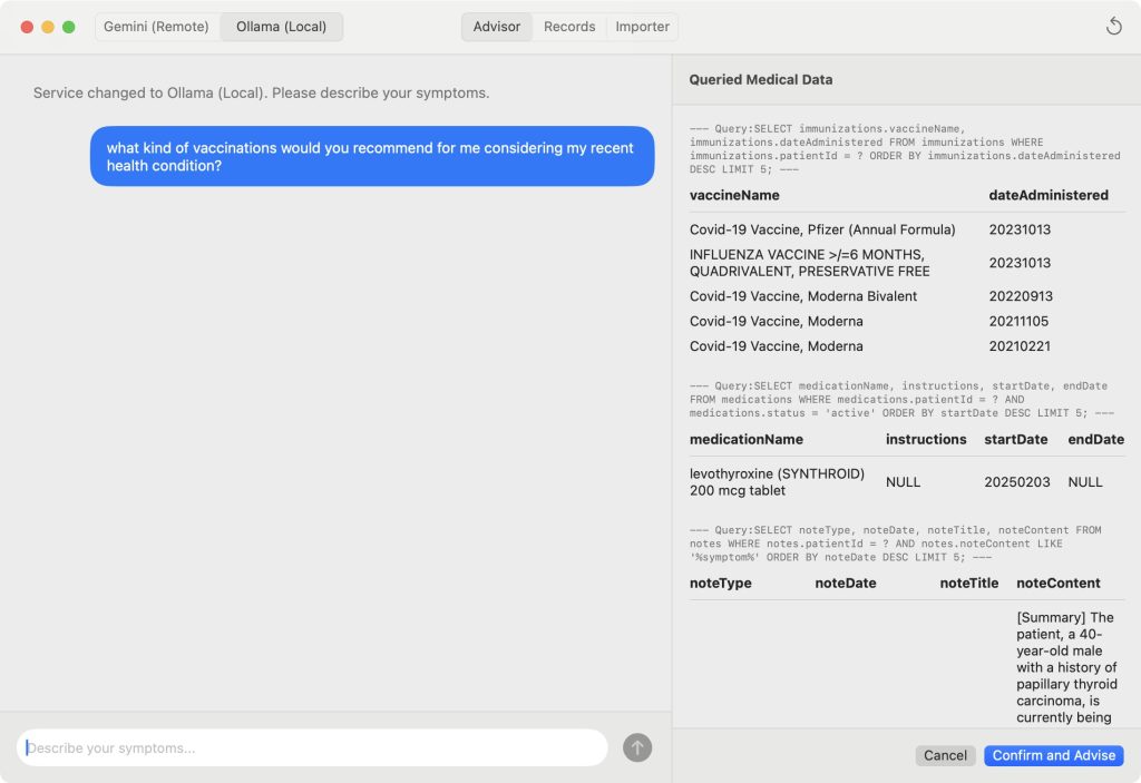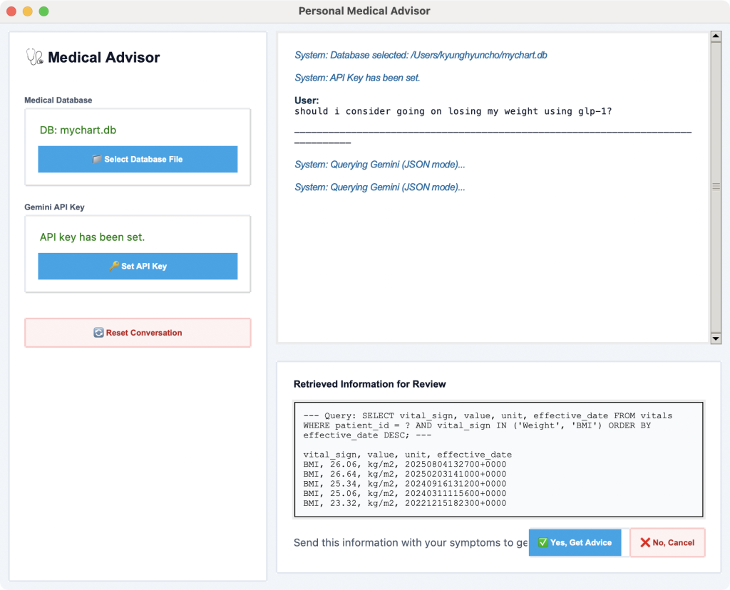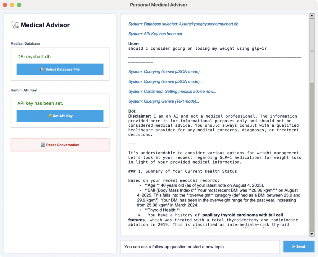 a few weeks ago, i spent one weekend to implement a native python version of an app that ingests these downloaded records (often in the forms of xml files) and lets me consult an LLM based on these records. the code is opensourced in https://github.com/kyunghyuncho/MyChartExplorer/tree/main/PythonVersion. this version focused a lot on whether i can build a data ingestion pipeline into sqlite3 database (since i planned to use it for my own local use case only) without having to learn about the xml schema too much. to do so, i used Google Gemini 2.5 Pro by uploading one of the many (100+) xml files of my own to gemini, and asking it to read it and devise both a database schema and ingestion code in python. this worked beautifully, and after just a couple of back and forth, i could write a code that reads these xml files, parse them and save important (but succinct) set of data into the database automatically. after this ingestion was done, it was pretty straightforward to ask Google Gemini to implement a tcl/tk based python app for querying Gemini to (1) generate a bunch of sql queries and (2) use the retrieved information to answer any question i had about myself and my health condition.