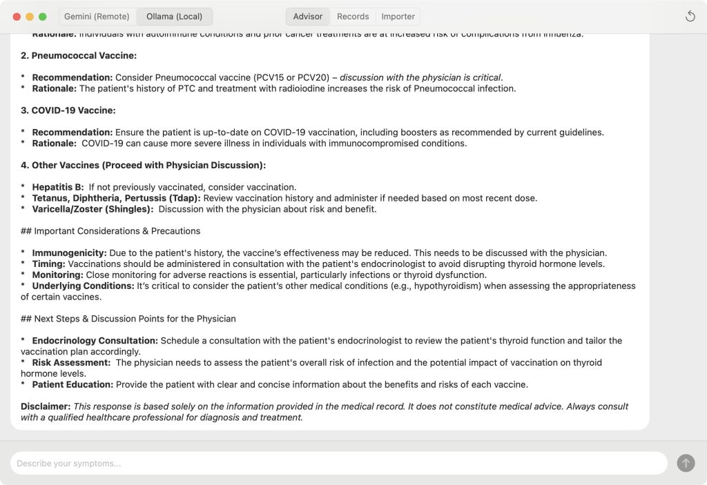 despite the name which contains “Gemini“, i also implemented using locally installed Ollama in this new version, as i started to get a bit more serious about supporting multiple back-end’s, although it was still all vibe-coded. this code was also opensourced in https://github.com/kyunghyuncho/MyChartExplorer/tree/main/GeminiMyChartExplorer. i’m super insecure about this app, however, since i still don’t know how to read nor write Swift. there could be a massive explosive bug in this code that will blow everything away, and i still couldn’t tell.