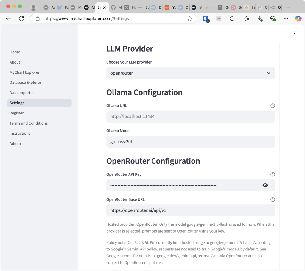 i opened up MyChartExplorer, removed the gemini-specific code and implemented openrouter as a new backend. it is still bring-your-own-api-key, but it is specifically easier to create an API key on openrouter and add a credit to it than to create a google cloud account, set up a google cloud project and add billing to it (Google really needs to get their act together here):